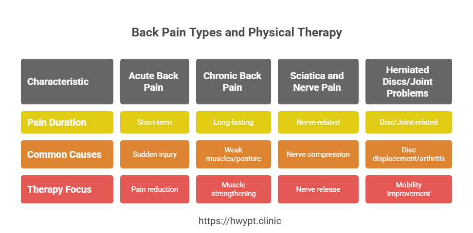 Not all back pain is the same. Some people feel pain all of a sudden. Others feel it slowly over time. No matter what kind you have, physical therapy for back pain can help you feel better and move more easily.